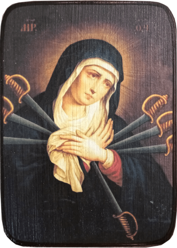 Богородица изображается в момент страдания - в ее сердце вонзаются семь острых мечей. Количество мечей символизирует необыкновенное горе, сердечную боль и сокрушение о судьбах человечества.