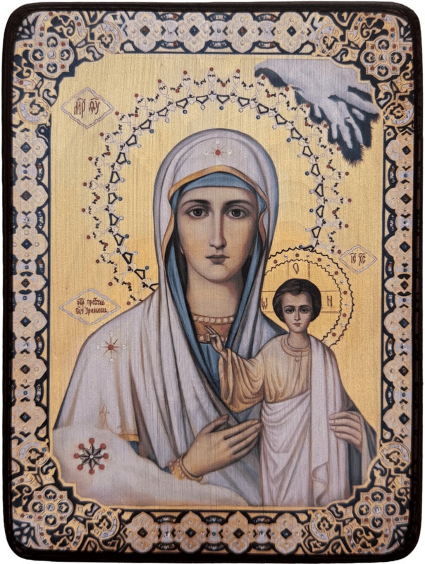 Обо всем этом прихожанка, пожелавшая остаться неизвестной, рассказала настоятелю храма во имя Николая Чудотворца игумену Гермогену (Еремееву). А он, в свою очередь, занялся поисками художника, который по описанию смог бы изобразить увиденный во сне лик Богоматери. Икона так и была написана - с еловой веткой в правом углу и большим кристаллом на снегу слева.