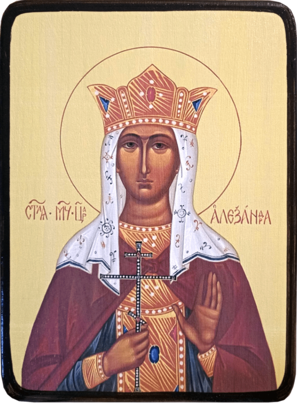 Святая Александра Римская (супруга императора Диоклетиана), была тайной христианкой. Видя твердость веры святого Георгия во время его мучений, она решилась открыто свидетельствовать о своей вере в Иисуса Христа. Она отправилась к месту, где мучили святого Георгия. Упав к ногам великомученика она перед всеми объявила себя христианкой.