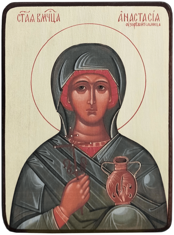 Святая Анастасия Узорешительница жила в период раннего христианства в III веке нашей эры. Была дочерью богатого и знатного римлянина. Она прославилась как целительница, духовная помощница заключенных в темницы христиан и верная последовательница Спасителя. За милосердие и самоотверженное служение заключенные назвали ее Узорешительницей, т.е. "облегчающей оковы". Когда в ней признали христианку, то подвергли мучениям. Святой великомученице молятся об облегчении уз находящихся в заточении, об обращении ко Христу заблудших и впадших в тяжкие преступления.