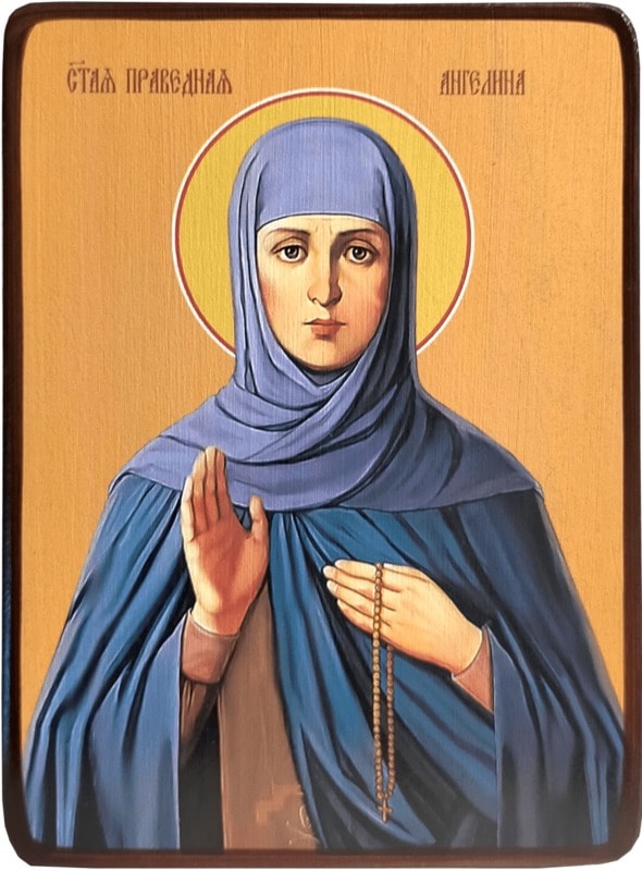 Святая Ангелина была дочерью князя Георгия Албанского и супруга Стефана, короля Сербии. Ангелина претерпела изгнание вместе со своим мужем и разделила все трудности жизни в Албании и Италии. Двух сыновей своих, святых Максима и Иоанна, воспитала в духе истинно христианском. По смерти супруга, приняв монашеский постриг, святая Ангелина посвятила себя молитве, благотворительности и храмостроительству.