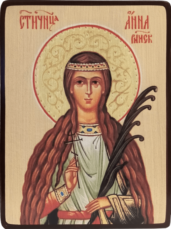 Мученица Анна родилась в Риме от благочестивых родителей и была воспитана в христианской вере. В 13 лет она отказала в замужестве сыну начальника области и была нагой отправлена в непотребный дом. Но по Божию изволению у нее выросли такие длинные волосы на голове, что покрыли все ее тело как одежда, а в доме встретил ее Ангел Божий и покрыл таким блистающим сиянием, что от этого блеска нечестивые юноши не могли смотреть на нее. Когда Анна начала молиться, то увидела перед собой белую одежду, сотканную Ангельскими руками. Юноша, виновник зла, вошел к ней и хотел совершить над ней насилие, но пал бездыханным, преданный Ангелом Божиим сатане. По просьбе отца юноши святая Анна воскресила своей молитвой умершего, который стал прославлять Бога. И от этого 160 человек уверовали во Христа, крестились, а спустя некоторое время язычники отсекли головы им и воскрешенному юноше.
