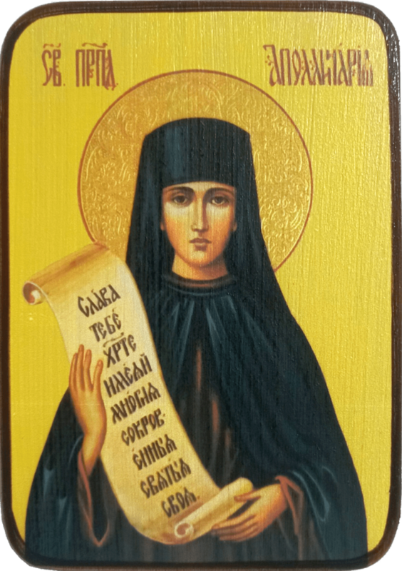 Преподобная Аполлинария была дочерью Анфемия (бывший правитель Греческой империи). Отказавшись от брака, она выпросила у своих родителей разрешение поклониться святым местам Востока. Прибыв из Иерусалима в Александрию, Аполлинария тайно от слуг переоделась в одежду инока и скрылась в одно болотистое место, где несколько лет подвизалась в строгом посте и молитвах. Затем она, назвав себя иноком Дорофеем, поступила в скит к святому Макарию Египетскому.