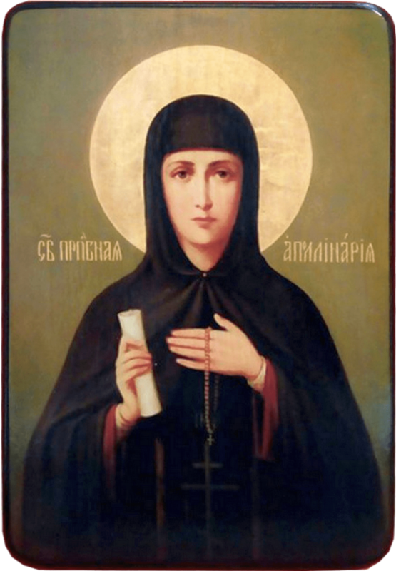 Преподобная Аполлинария была дочерью Анфемия (бывший правитель Греческой империи). Отказавшись от брака, она выпросила у своих родителей разрешение поклониться святым местам Востока. Прибыв из Иерусалима в Александрию, Аполлинария тайно от слуг переоделась в одежду инока и скрылась в одно болотистое место, где несколько лет подвизалась в строгом посте и молитвах. Затем она, назвав себя иноком Дорофеем, поступила в скит к святому Макарию Египетскому.