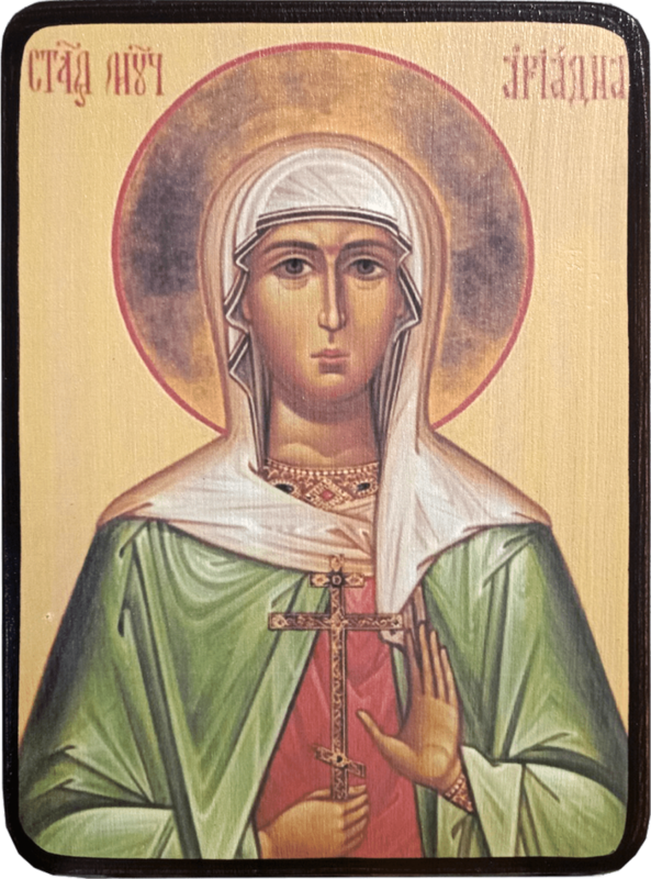 Святая мученица Ариадна была рабыней Тертилла (старейшины города Промиссии) при императоре Адриане (117-161. Однажды, когда хозяин по случаю рождения сына совершал жертвоприношение языческим богам, христианка Ариадна отказалась участвовать в нечестивом торжестве. За это ее подвергли жестоким побоям. Ариадну подвесили и рвали тело острыми железными крюками. Потом мученицу бросили в темницу и долго морили голодом, принуждая поклониться идолам. Когда святую освободили из темницы, она ушла из города, но Тертилл послал за ней погоню. Увидев, что ее преследуют, святая мученица побежала, взывая к Богу, чтобы Он защитил ее от врагов. Внезапно по ее молитве в горе образовалась расщелина, и святая Ариадна скрылась в ней. Это чудо привело в смятение и страх преследователей, и они в помрачении ума начали избивать друг друга копьями.