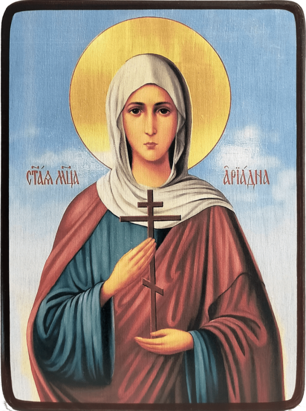 Святая мученица Ариадна была рабыней Тертилла (старейшины города Промиссии) при императоре Адриане (117-161. Однажды, когда хозяин по случаю рождения сына совершал жертвоприношение языческим богам, христианка Ариадна отказалась участвовать в нечестивом торжестве. За это ее подвергли жестоким побоям. Ариадну подвесили и рвали тело острыми железными крюками. Потом мученицу бросили в темницу и долго морили голодом, принуждая поклониться идолам. Когда святую освободили из темницы, она ушла из города, но Тертилл послал за ней погоню. Увидев, что ее преследуют, святая мученица побежала, взывая к Богу, чтобы Он защитил ее от врагов. Внезапно по ее молитве в горе образовалась расщелина, и святая Ариадна скрылась в ней. Это чудо привело в смятение и страх преследователей, и они в помрачении ума начали избивать друг друга копьями.