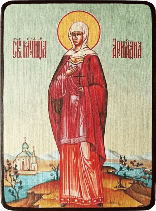 Святая мученица Ариадна была рабыней Тертилла (старейшины города Промиссии) при императоре Адриане (117-161. Однажды, когда хозяин по случаю рождения сына совершал жертвоприношение языческим богам, христианка Ариадна отказалась участвовать в нечестивом торжестве. За это ее подвергли жестоким побоям. Ариадну подвесили и рвали тело острыми железными крюками. Потом мученицу бросили в темницу и долго морили голодом, принуждая поклониться идолам. Когда святую освободили из темницы, она ушла из города, но Тертилл послал за ней погоню. Увидев, что ее преследуют, святая мученица побежала, взывая к Богу, чтобы Он защитил ее от врагов. Внезапно по ее молитве в горе образовалась расщелина, и святая Ариадна скрылась в ней. Это чудо привело в смятение и страх преследователей, и они в помрачении ума начали избивать друг друга копьями.
