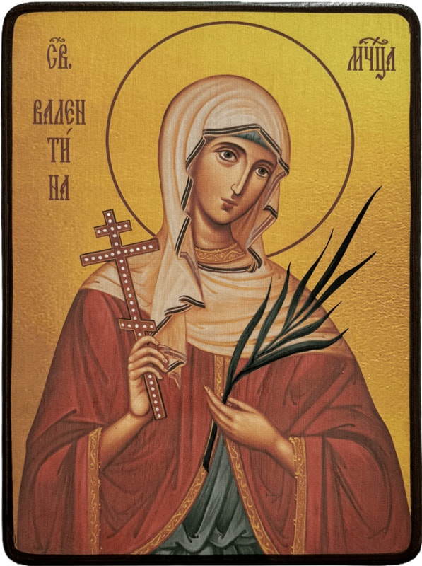 Святая Валентина родилась в окрестностях палестинского города Кесарии, на берегу Средиземного моря. В Кесарии, как в самом большом городе области, пребывали многие представители римской императорской власти, которые именовались римскими прокураторами. Сегодня, когда проезжаешь по развалинам Кесарии, невозможно поверить, что когда-то на этом месте стоял огромный город. Святая Валентина была очень красивой девушкой. И красота ее была не только телесная, но и душевная, что отмечали все люди, которые знали девушку. Но окружающим было известно еще и то, что святая Валентина отказывалась чтить языческих богов. Когда слухи об этом донеслись до правителя Фирмилиана, он приказал привести святую Валентину к нему на суд. Под страхом смерти Фирмилиан призвал мученицу отказаться от христианской веры и принести жертву идолам. Но она смело бросила камень на жертвенник и обратилась спиной к пылавшему на нем огню. Ее нещадно били и приговорили к усечению мечом.