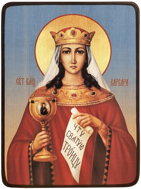 Эта умная и красивая девушка претерпела множество пыток за Христа по отцовской языческой злобе. Перед казнью святая Варвара молила Бога, чтобы все, кто будут, вспоминая ее мученичество, просить ее помощи, были избавлены от внезапной смерти без исповеди и причащения Святых Христовых Таин. Господь принял просьбу мученицы. Именно поэтому Варвара - уникальная святая, она единственная, которой Церковь усвоила на иконе держать Святой Потир, которого по канонам Церкви не может касаться никто из мирян - только священник.