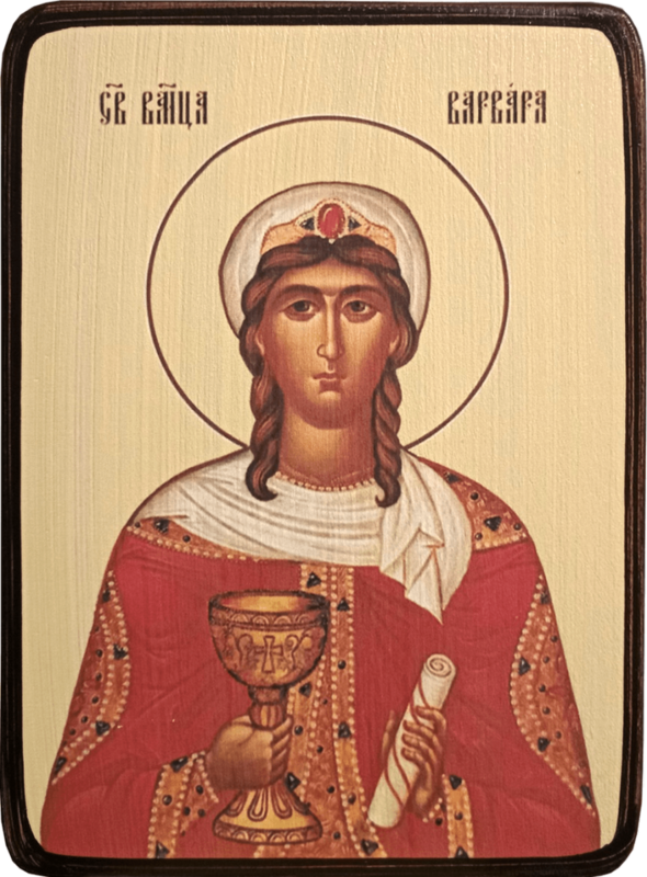 Эта умная и красивая девушка претерпела множество пыток за Христа по отцовской языческой злобе. Перед казнью святая Варвара молила Бога, чтобы все, кто будут, вспоминая ее мученичество, просить ее помощи, были избавлены от внезапной смерти без исповеди и причащения Святых Христовых Таин. Господь принял просьбу мученицы. Именно поэтому Варвара - уникальная святая, она единственная, которой Церковь усвоила на иконе держать Святой Потир, которого по канонам Церкви не может касаться никто из мирян - только священник.