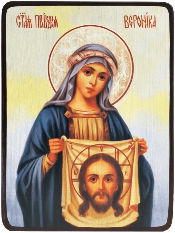 Святая Вероника Праведная была в Иерусалиме во время осуждения Иисуса Христа на крестные страдания. Когда он нёс свой крест на Голгофу, Вероника слилась с толпой иудеев и следовала за ним. Увидев, что он от тяжестью креста упал, она сжалилась над ним и подбежав, напоила его водой. Сделав это, она полотенцем вытерла окровавленное лицо Иисуса.
