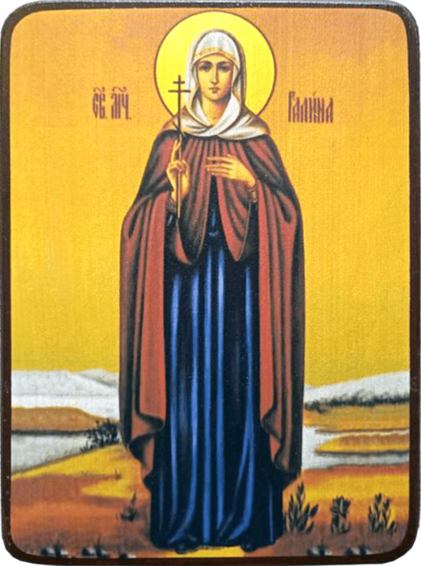 Святая мученица Галина родилась в начале III века нашей эры в Коринфе (Греция). Праведная Галина и многие другие христиане - Леонид, Ника, Василисса, Феодора, Хариесса, Калиса, Нунехия, были учениками святого мученика Кондрата. Все они пострадали за веру Христову. Но ни один из них не отрекся от Христа, несмотря на предстоящие перед ними страшные мучения и казнь. Подобно святому Кондрату, все они были замучены до смерти, а несколько человек, включая Галину, брошены в море рядом с Коринфским заливом. Но они не утонули, а пошли по воде, воспевая духовные гимны. Разозлённые мучители догнали их на лодке и, повесив на их шеи камни, утопили мучеников.
