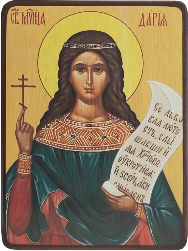 Святая мученица Дария Римская почитается Православной Церковью вместе со своим мужем - святым мучеником Хрисанфом. В юности Дария Римская исповедовала язычество. Выйдя замуж за христианина Хрисанфа, она была обращена им во Христианство. По обоюдному согласию супруги стали вести девственную жизнь, а после смерти отца Хрисанфа поселились в отдельных домах. В 283 году, во времена гонений на христиан императора Нумериана, Хрисанф и Дария за открытое исповедание веры во Христа были подвергнуты жестоким истязаниям, а затем заживо закопаны в землю.