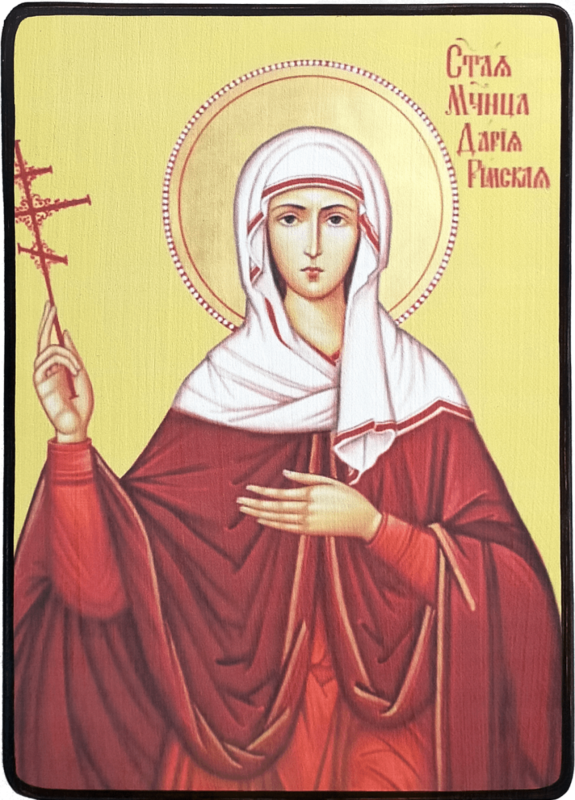 Святая мученица Дария Римская почитается Православной Церковью вместе со своим мужем - святым мучеником Хрисанфом. В юности Дария Римская исповедовала язычество. Выйдя замуж за христианина Хрисанфа, она была обращена им во Христианство. По обоюдному согласию супруги стали вести девственную жизнь, а после смерти отца Хрисанфа поселились в отдельных домах. В 283 году, во времена гонений на христиан императора Нумериана, Хрисанф и Дария за открытое исповедание веры во Христа были подвергнуты жестоким истязаниям, а затем заживо закопаны в землю.